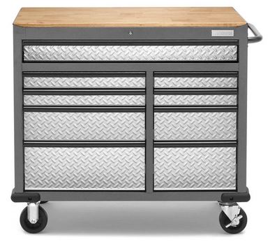 Make the most of your tool storage with the Gladiator® 41" 9 Drawer Cabinet Mobile Workbench. Armed with a 3/4" solid wood top and welded steel construction, this heavy-duty tool storage solution can hold up to 1500 lbs: plenty of strength to handle a range of gear and tools.Read More